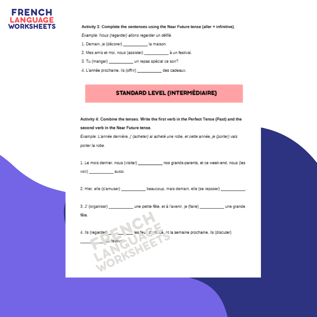 GCSE French 5.2 worksheet on Les fêtes dans le passé et à l’avenir - practise combining past and near-future tenses, and master definite and indefinite articles through festival-themed activities.