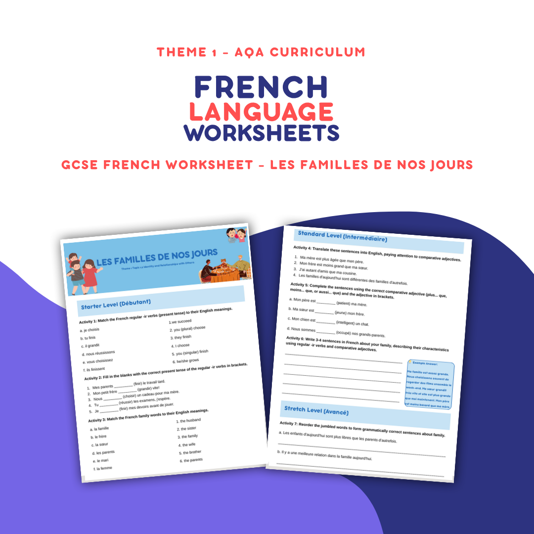 Explore modern family life in France with this GCSE French Worksheet: Les familles de nos jours, created to support AQA Theme 1 – Identity and Relationships with Others. This engaging resource helps students build key vocabulary, practise reading and writing skills, and develop confidence using topic-relevant grammar and structures.This is the new 2024 onwards curriculum.